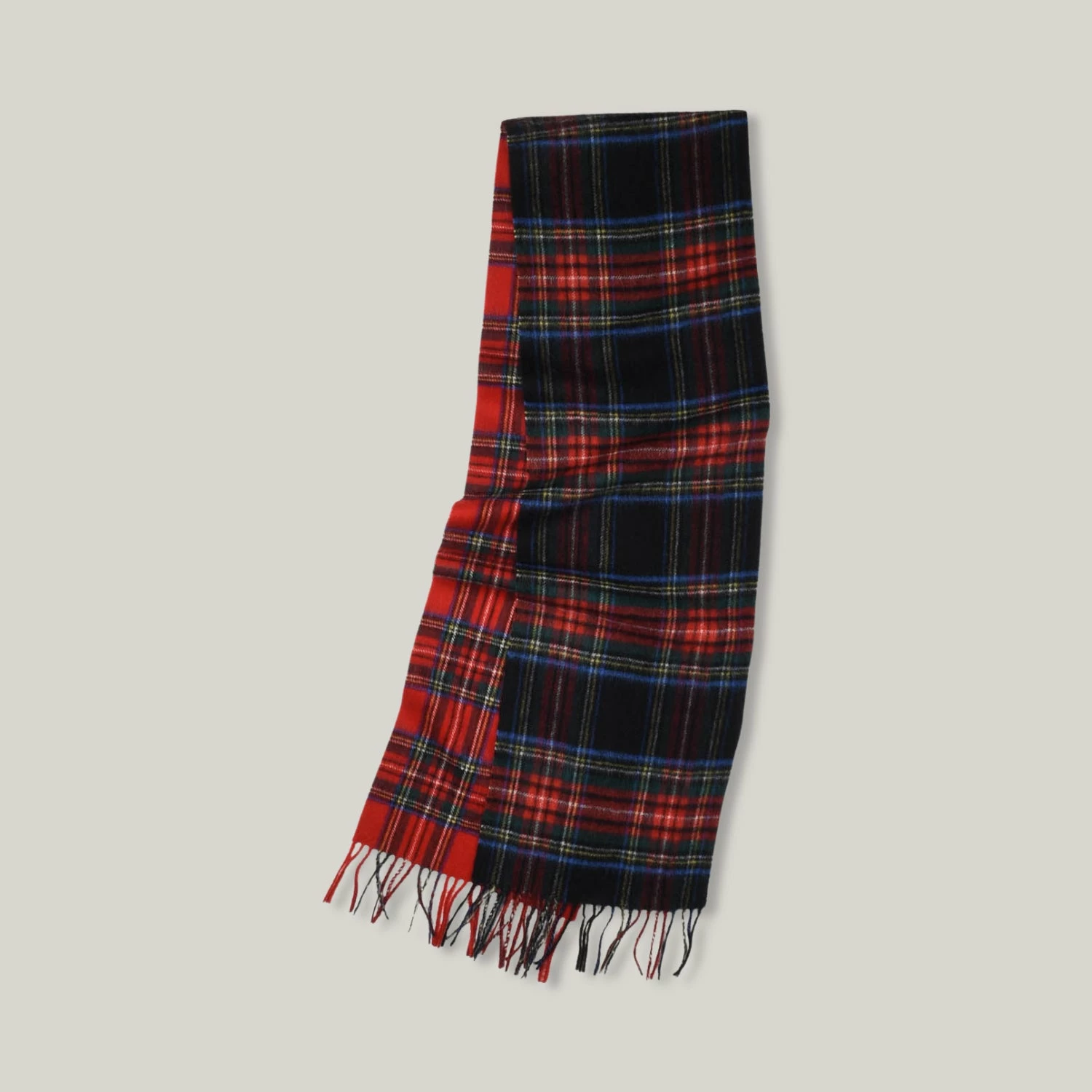 Made from a soft, cosy wool, this scarf utilises two different classic tartans, felted together in the middle to give you outfit options. Tasselled hem finish.
