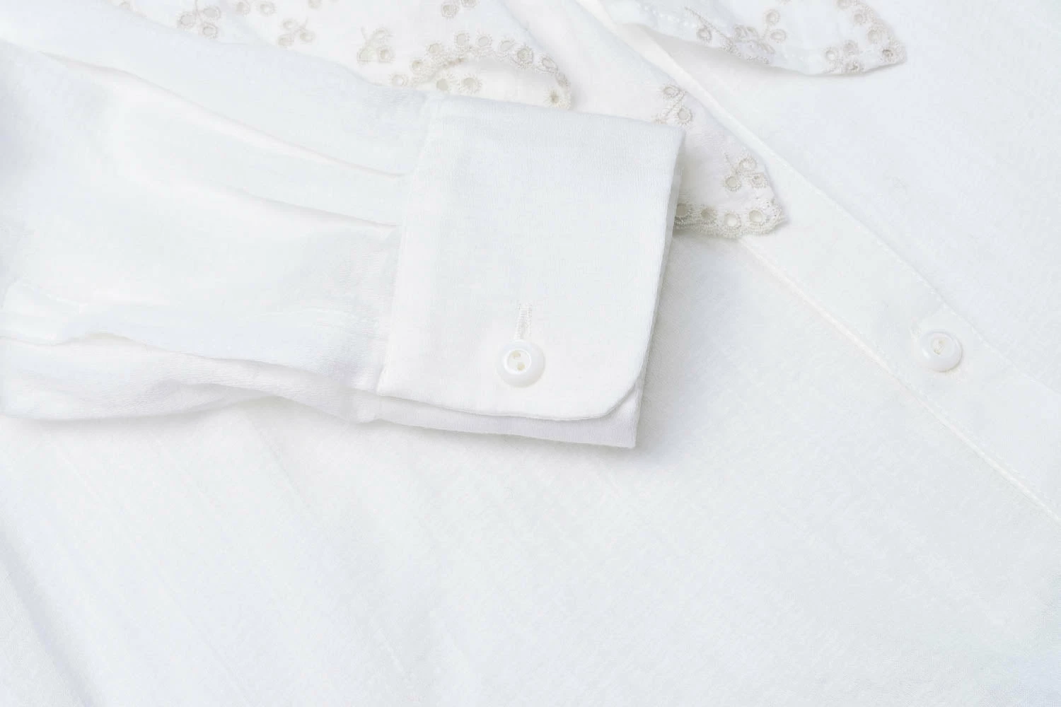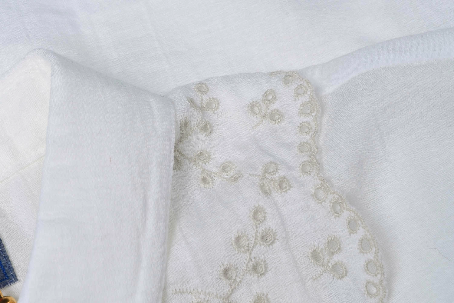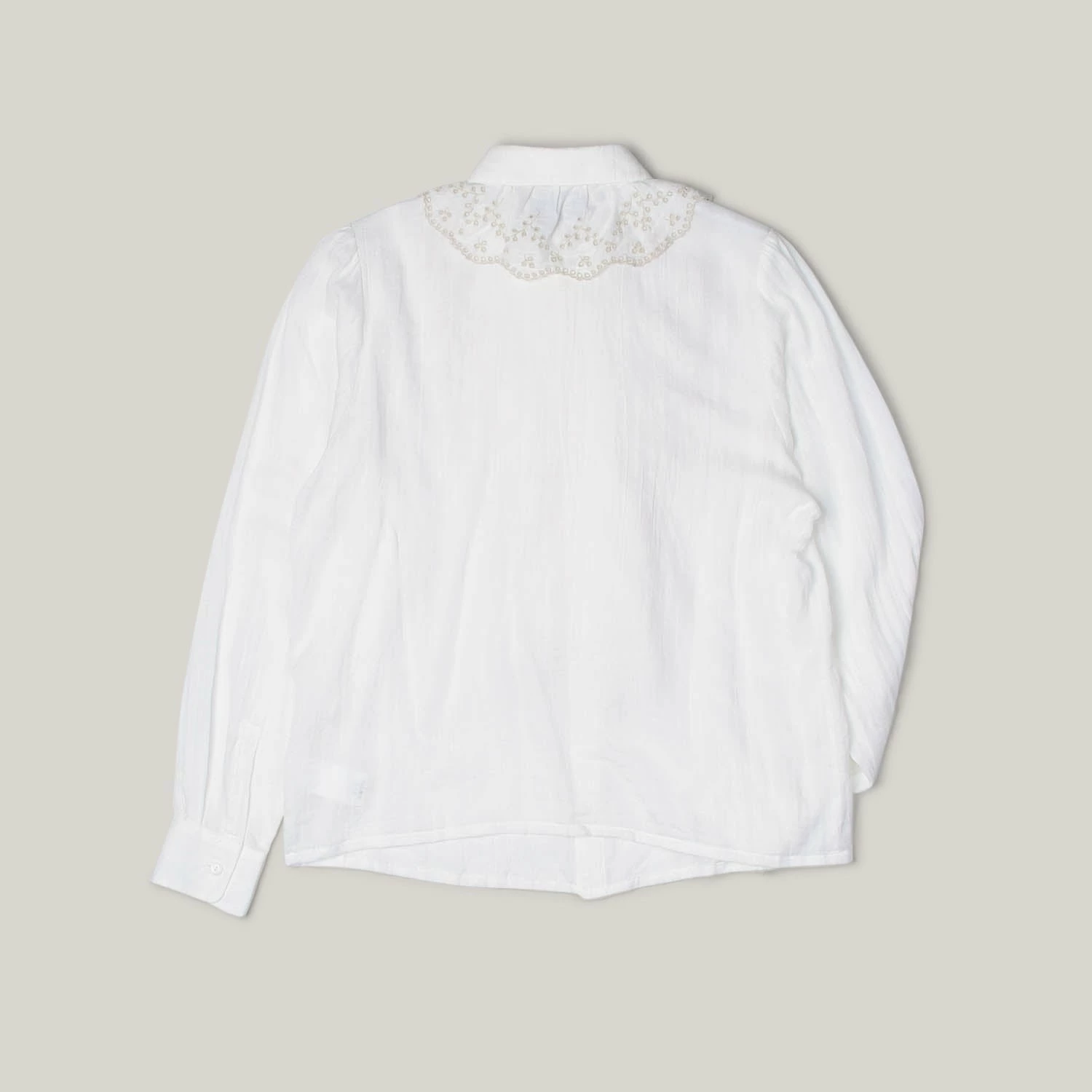 This is one of those pieces that Blue blue create that is neither indigo dyed nor Japanese in inspiration, yet is so stunning it transcends the collection. Made in a smooth dobby satin with large ruffled, broderie anglaise bib and three buttoned placket. Victorian in aesthetic but beautiful and very wearable.