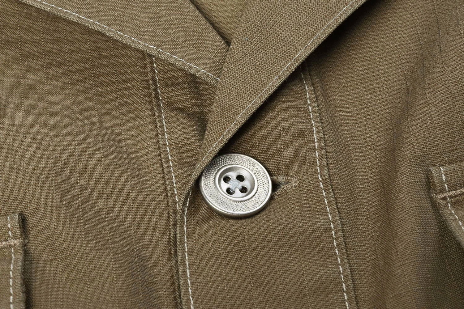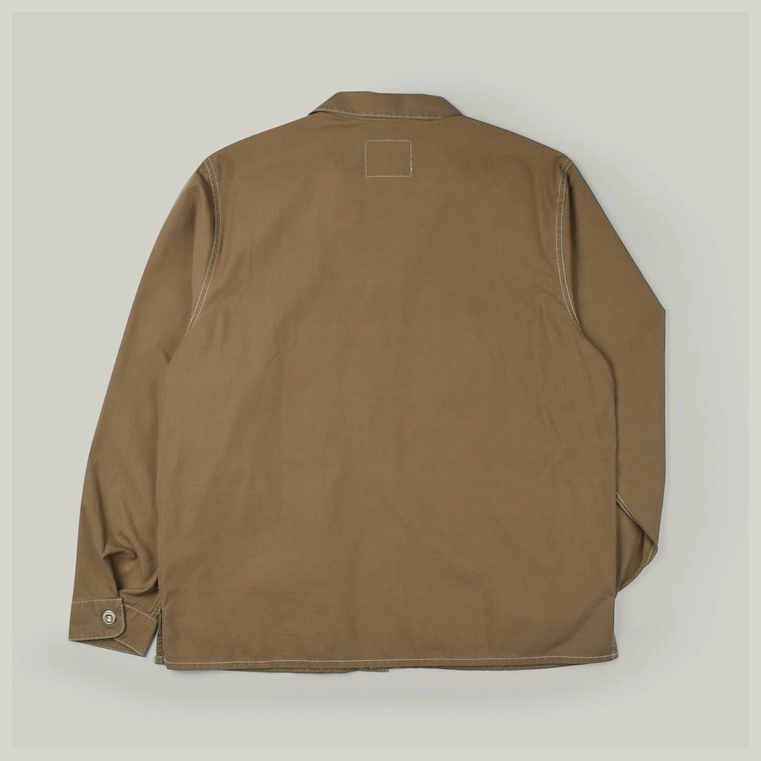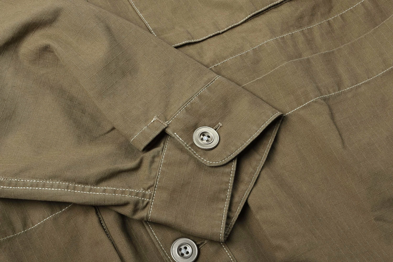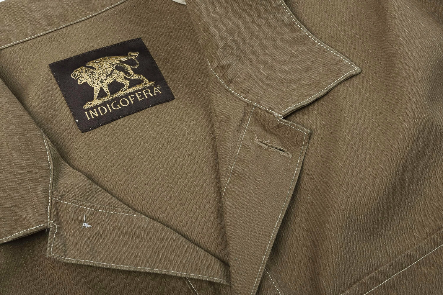 Long sleeve shirt that is much more like a jacket. Constructed in a washed cotton ripstop fabric, with military-inspired four front pocket configuration. Features Indigofera original metal buttons.