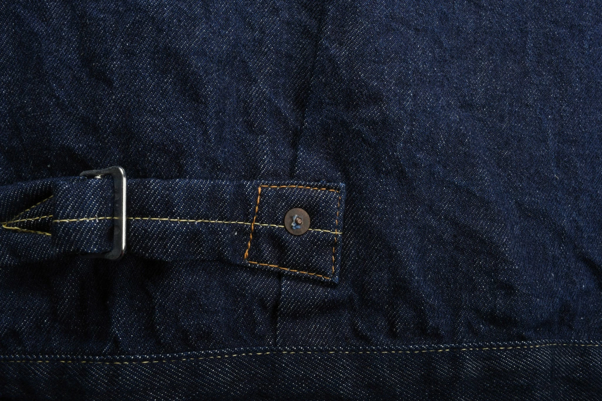 Where it all started in regards to denim jackets and eponymously named the Type I as a result. With a single left pocket on front and cinch on back, to the now famous pleat tuck detail to allow for middle age spread and further growth. It is an icon, much copied and rarely bettered. Further details include gold & tobacco contrast stitching used throughout. This one was made a few years ago when Cone Mills Denim shut down and they shifted all timeline denim construction to Turkey. Size 42 is a large equivalent.