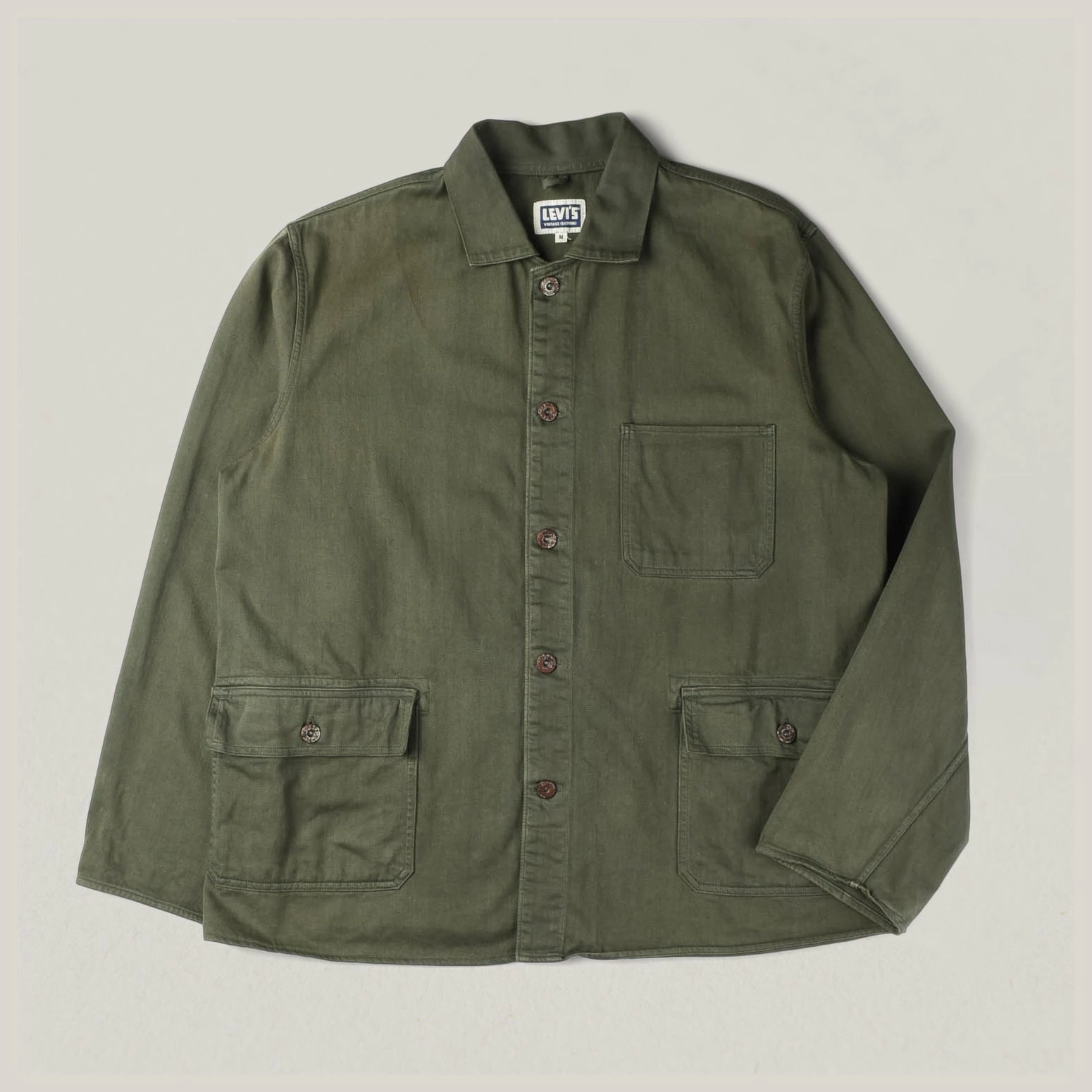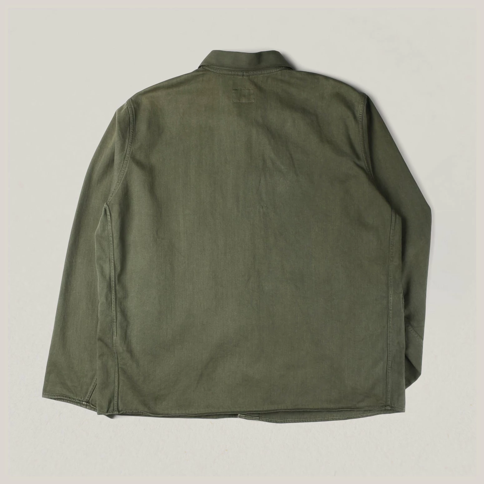 From an old LVC collection comes this chore-style coat in a soft gabardine cotton, with slightly rusted metal pressed buttons, two flapped front pockets and one chest pocket. Boxy medium in army green.
