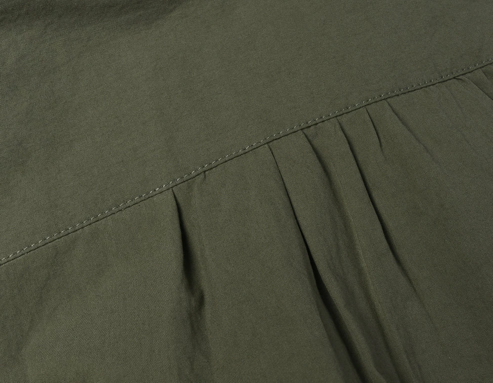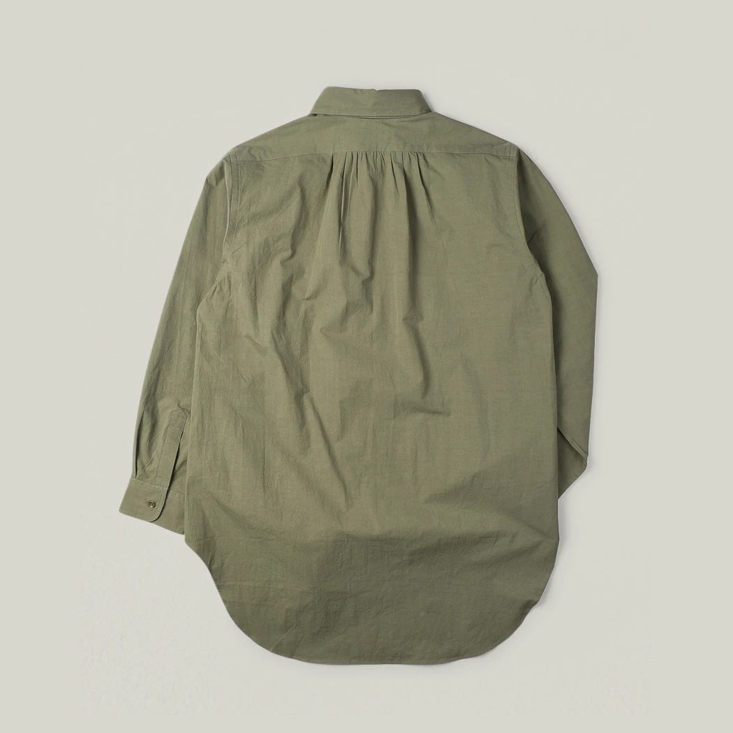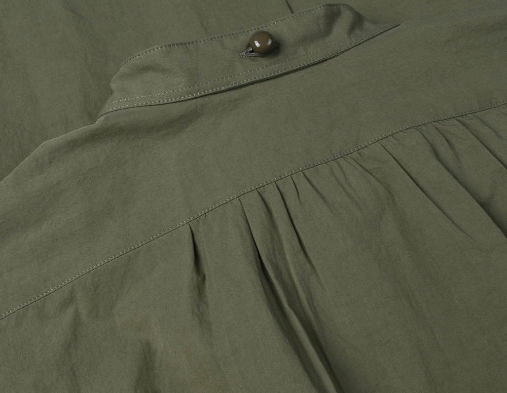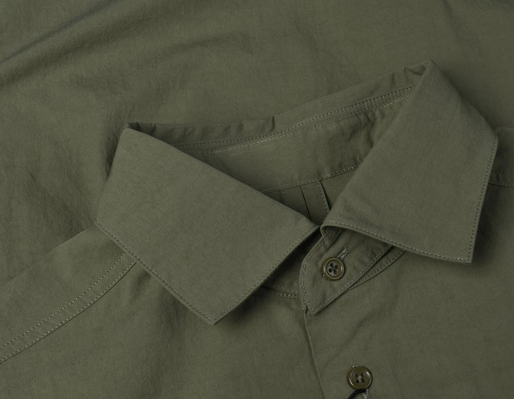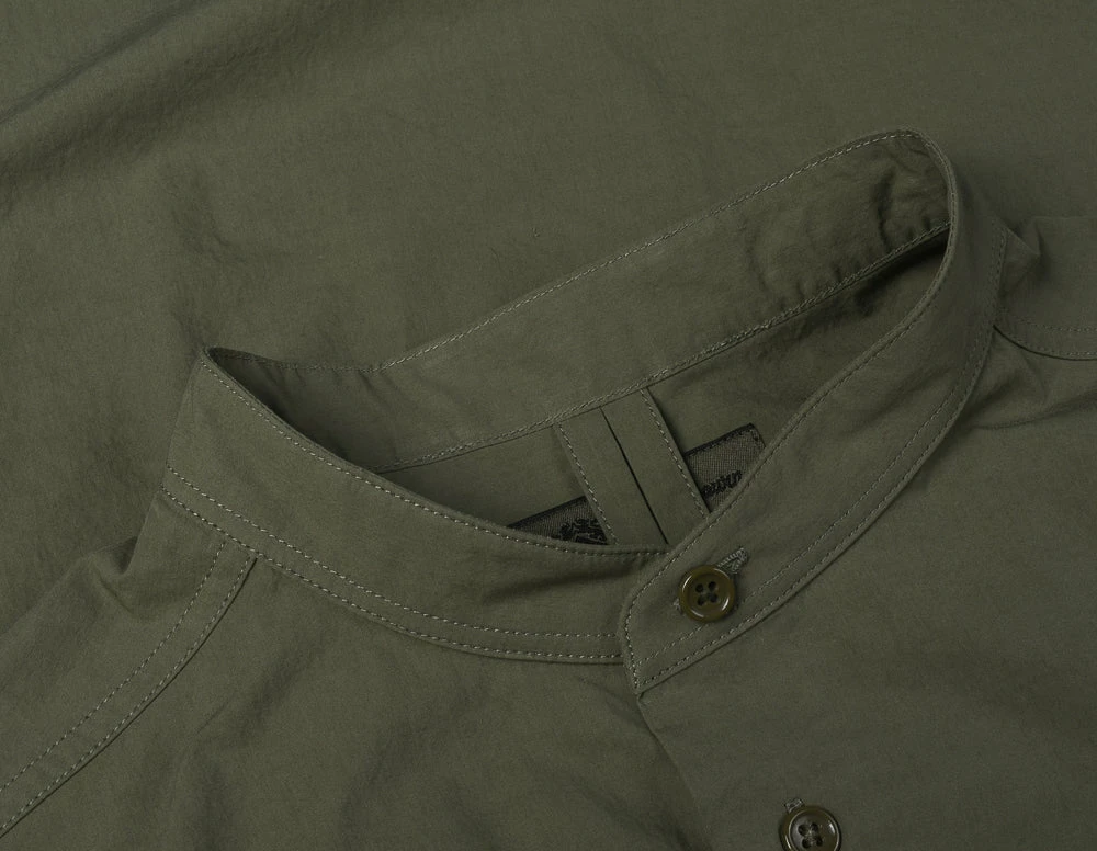 Mainline dress shirt cut in a vintage shape with extra long hem to ensure it doesn’t come untucked, also with detachable collar so it can be worn smart and more casually depending on the occasion. The fabric is a super lightweight cotton in military green.