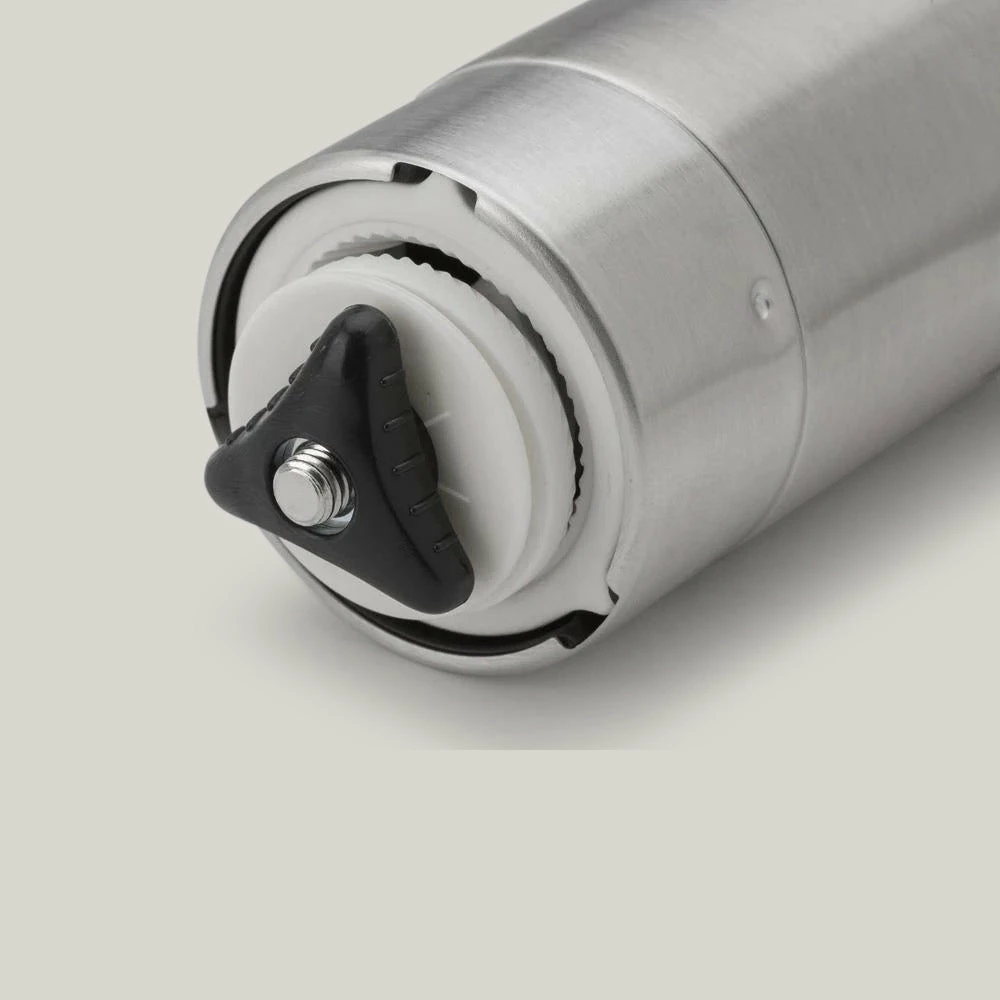 For that much needed cup of Joe first thing in the morning or after a long, wet hike, the coffee mill has been modelled after professional barista equipment and made of stainless steel. It features an adjustable ceramic burr and produces a variety of coffee grounds, depending on your preferred method of preparation. Take it camping or use at home for fresh coffee. Place coffee beans in the top container and turn the handle to grind.