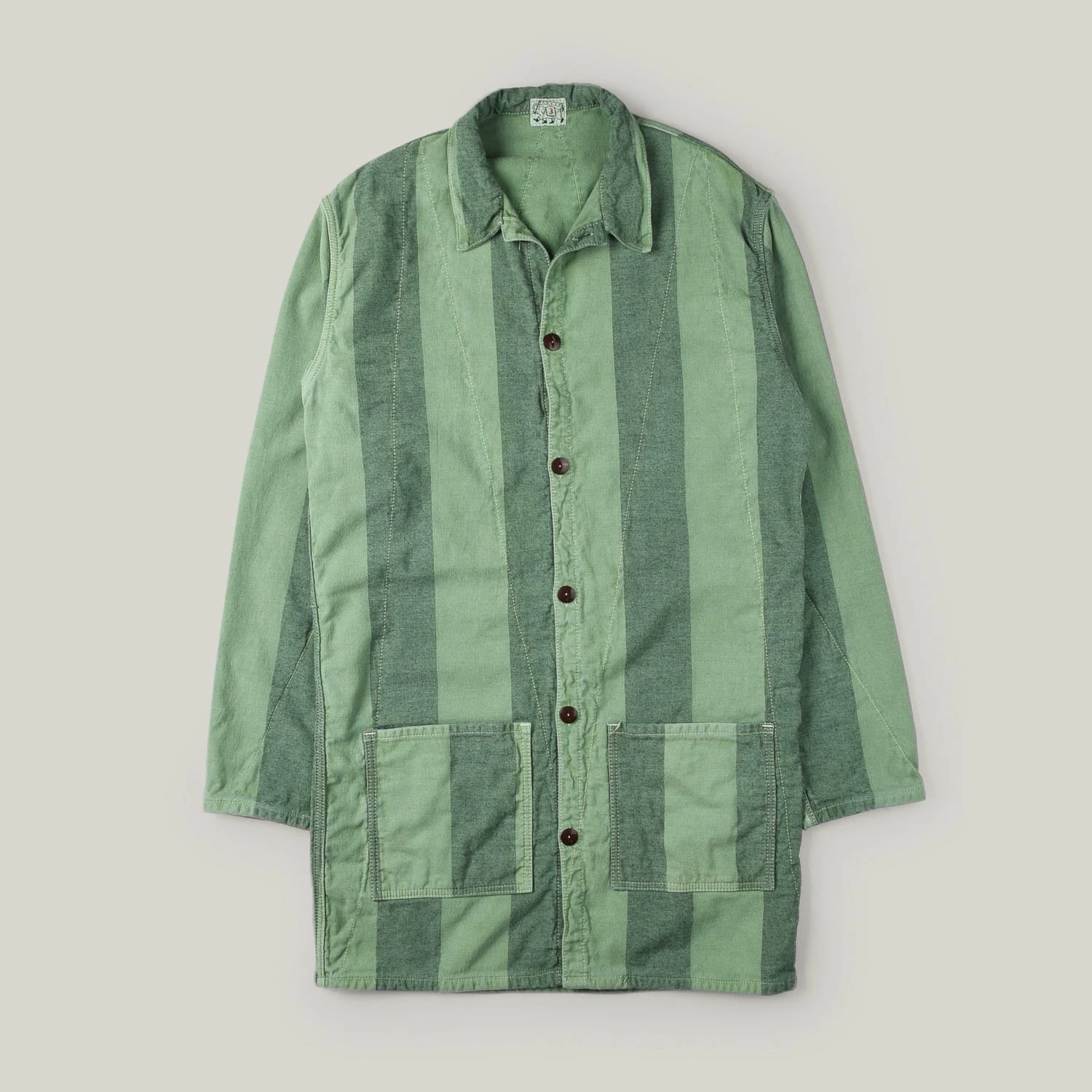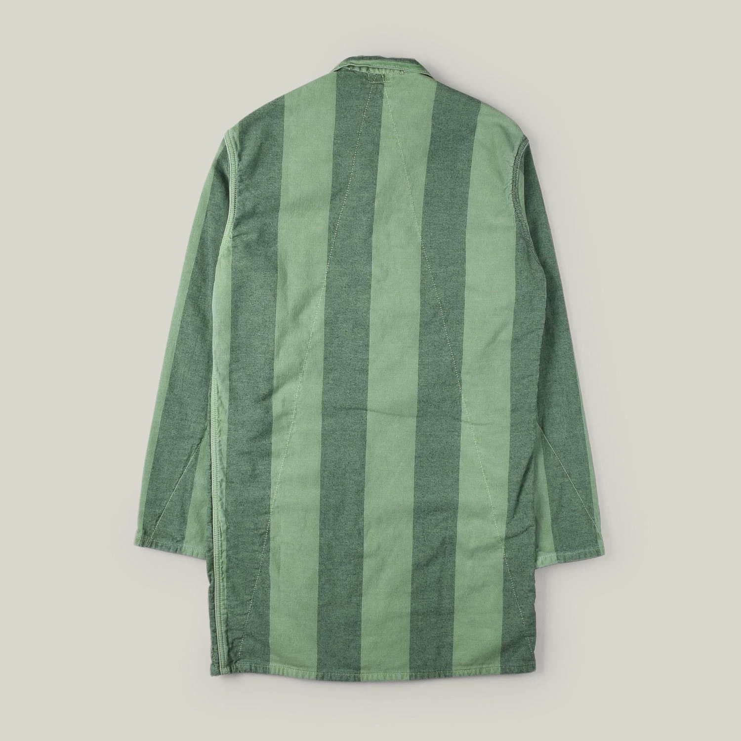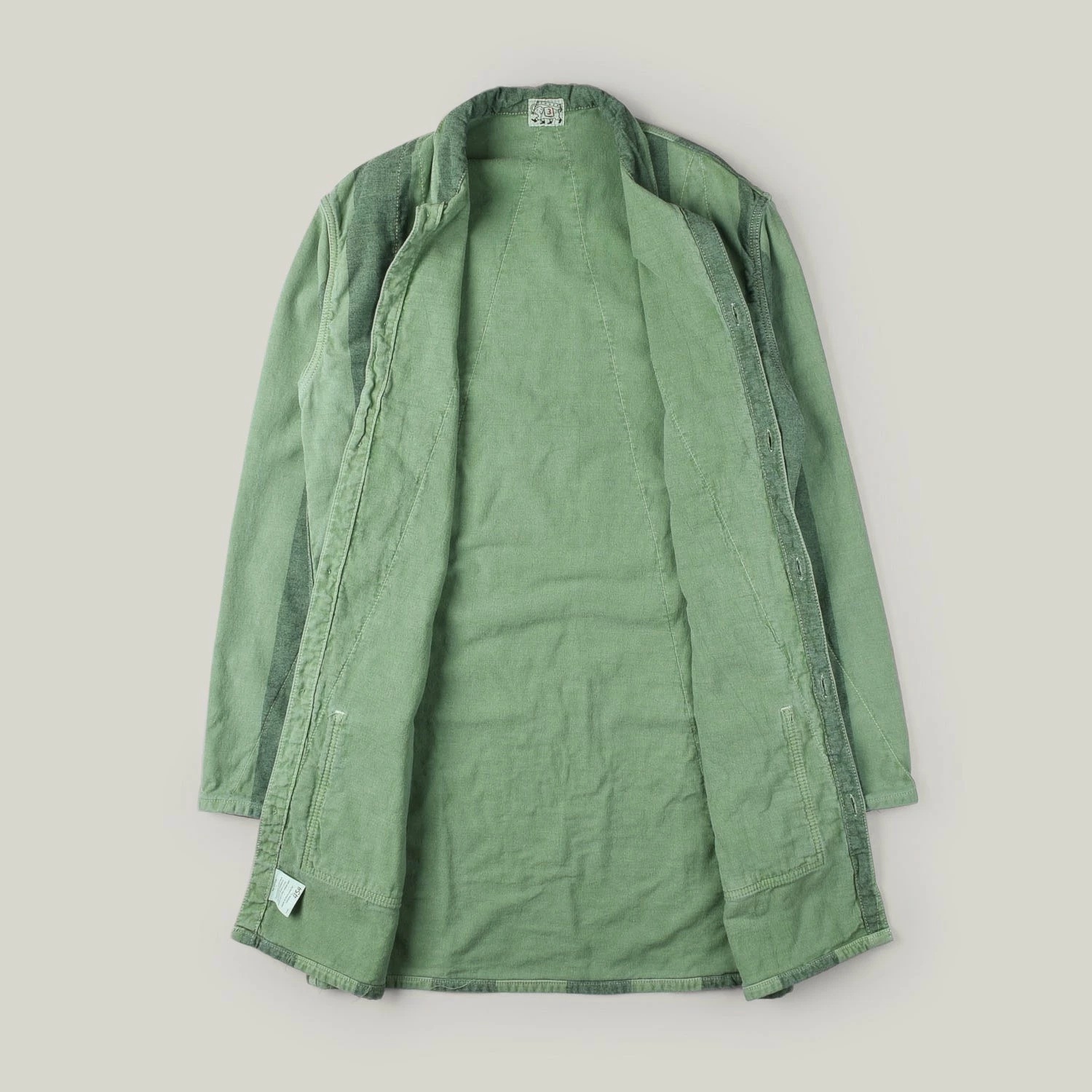 The Gambeson Lined Shirt takes its name from the medieval long quilted garment worn underneath, or instead of, metal armour. Each panel is fully lined with cotton casement and quilted in a single V- stitch line from one corner to the other. Labelled as a shirt, this is definitely more a shop coat, slim and long in proportion with long sleeves to be rolled.