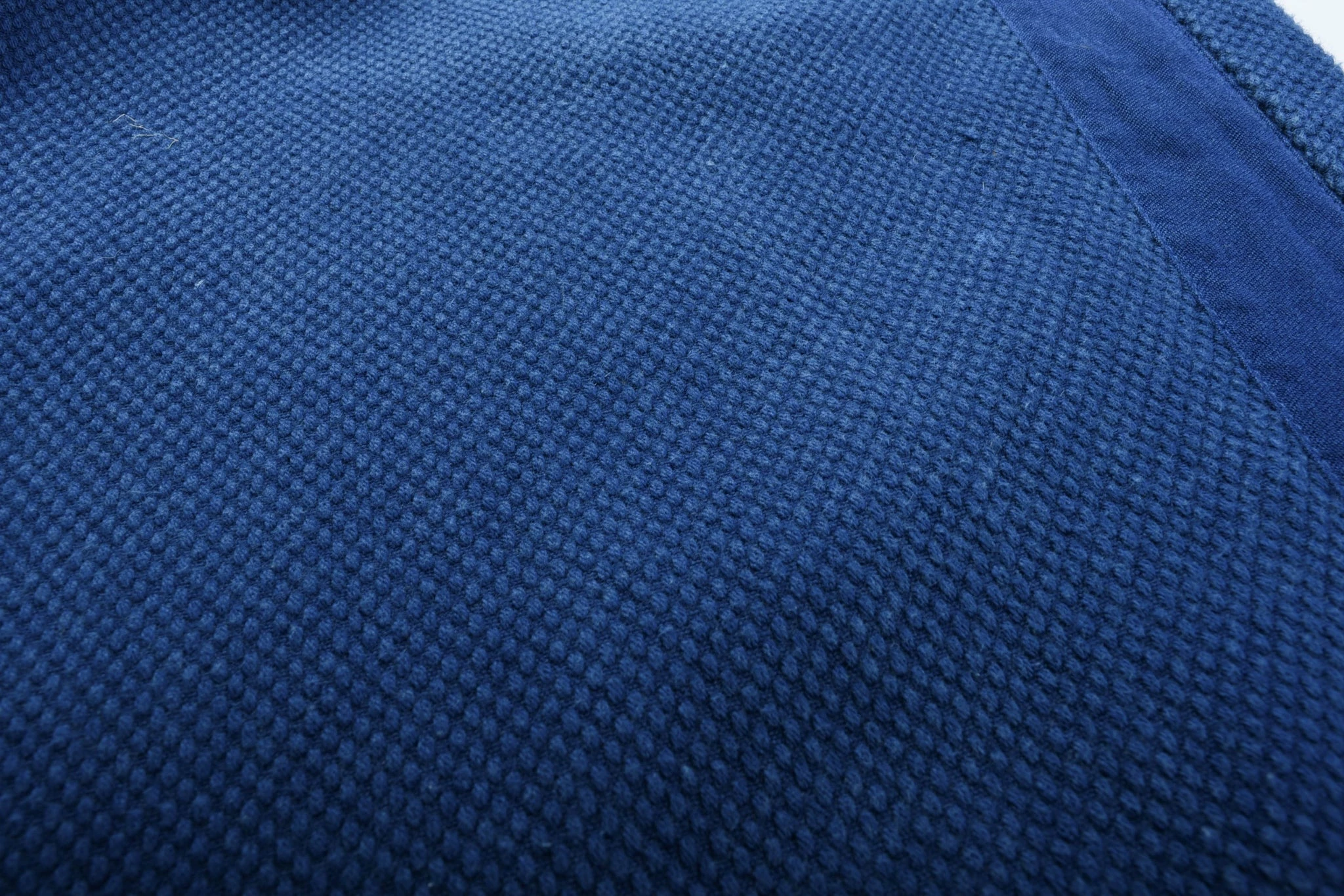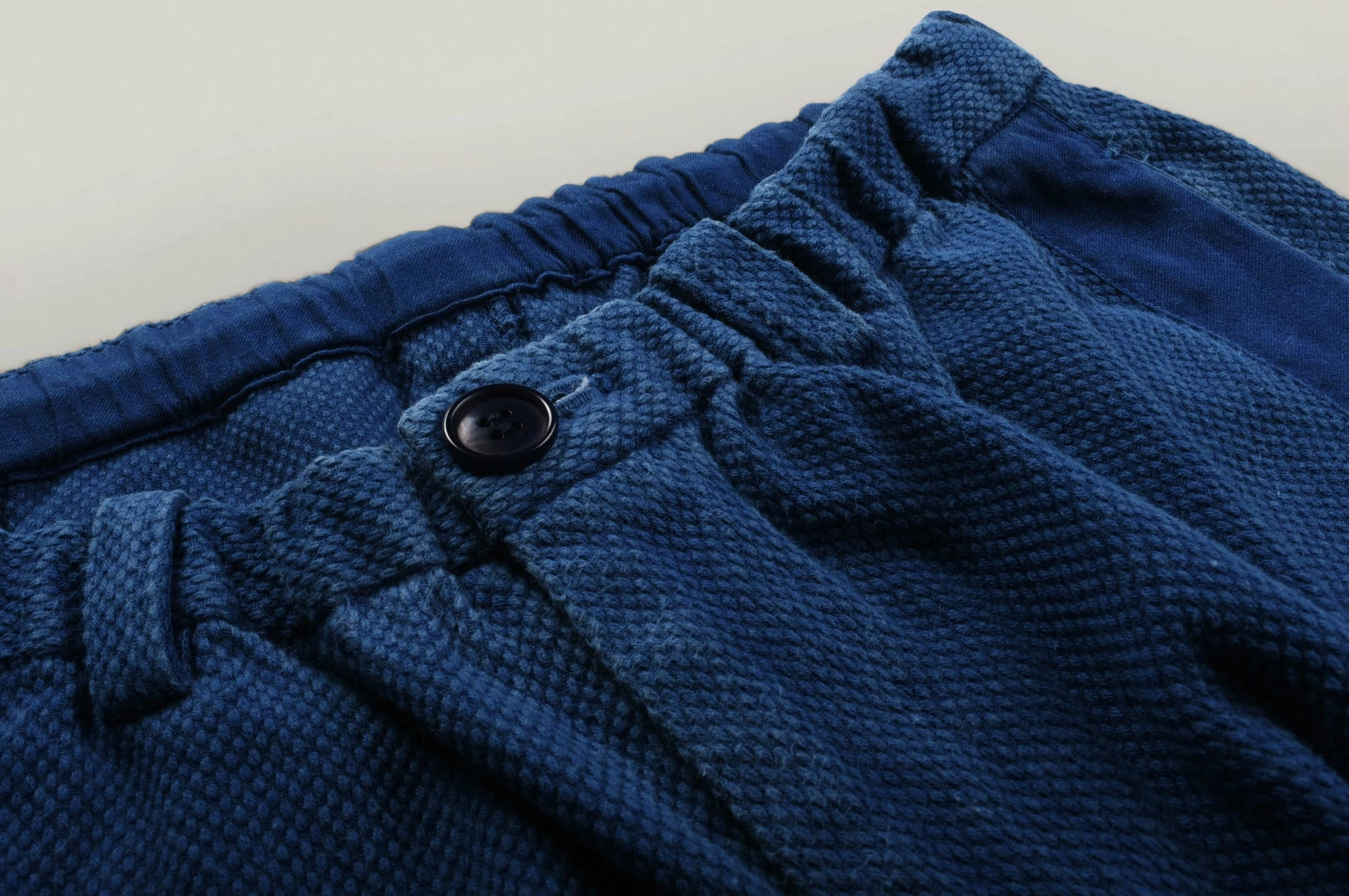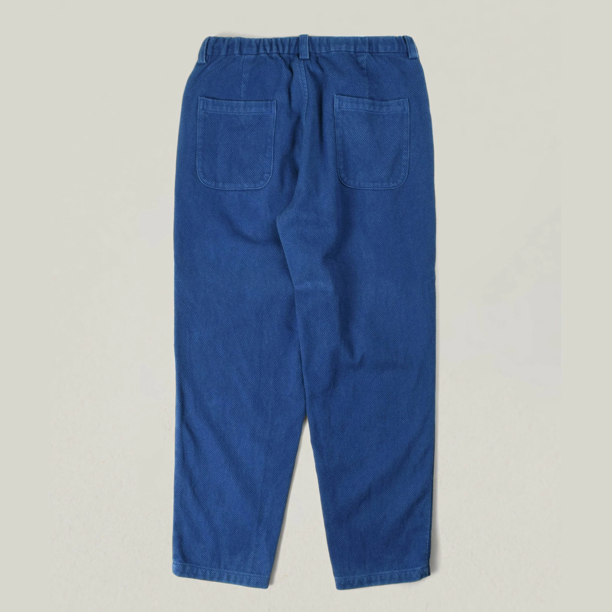 Made in the excellent judo ‘sashiko’ cloth, these trousers from blue blue have been indigo dyed to a lighter blue hue then finished with a satin band down each outseam. Details include zip fly, belt loops and elasticated waist, just to make sure you’re covered on all waist angles. This material is incredibly comfortable and feels like a hug on your thighs. The fit is relaxed with a taper.