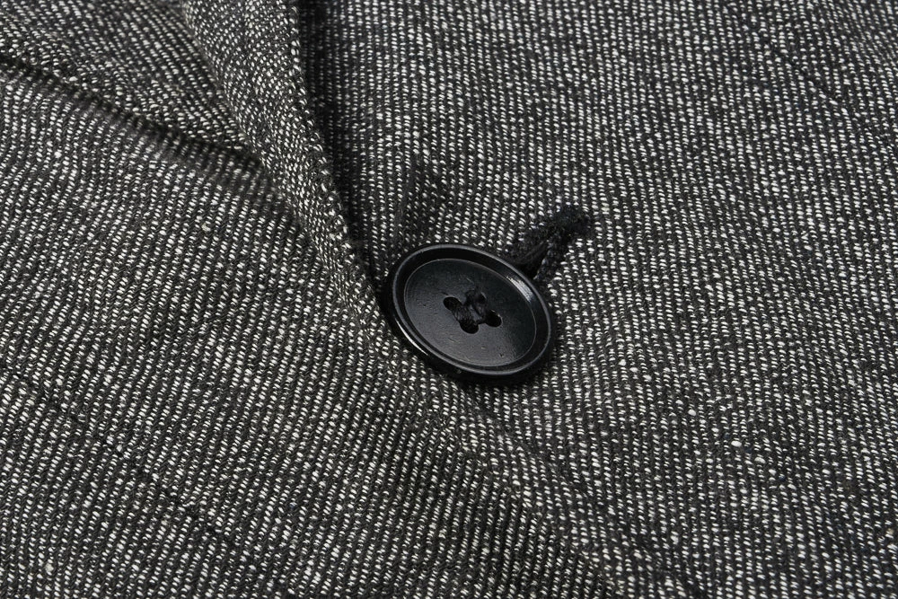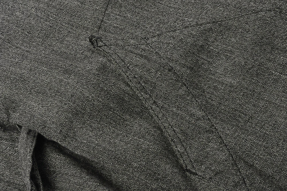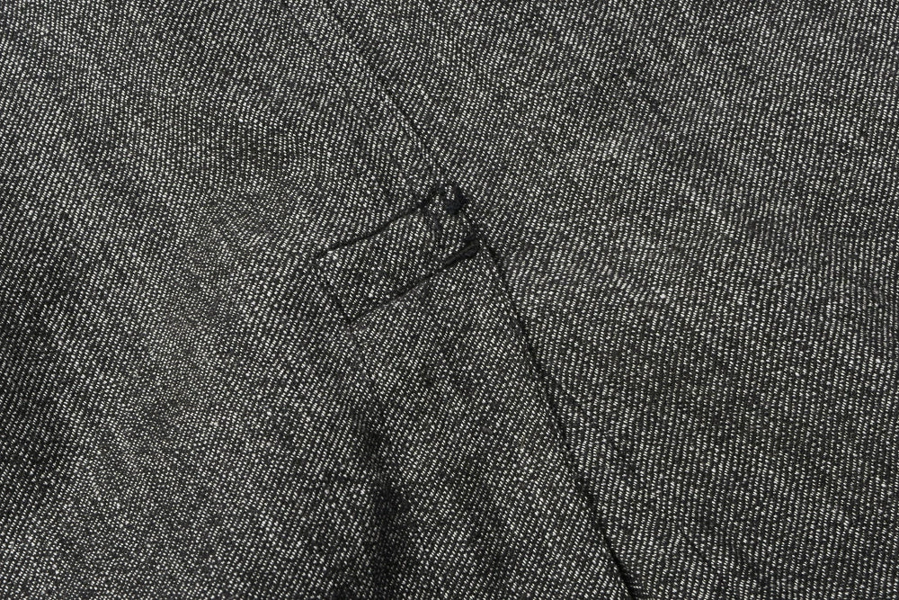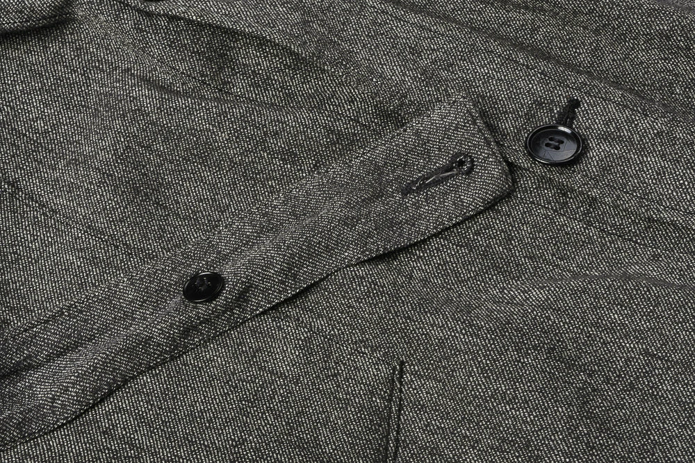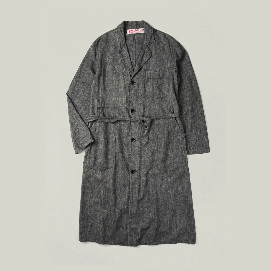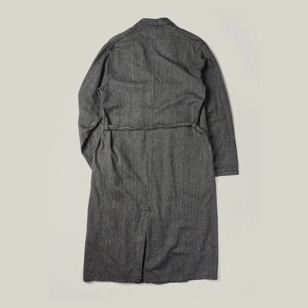 Bought from a vintage market in Japan, this long shop coat is constructed in a fetching salt & pepper cotton fabric, Details include two large front patch pockets, one breast pocket and a buttoned belt in the same fabric.