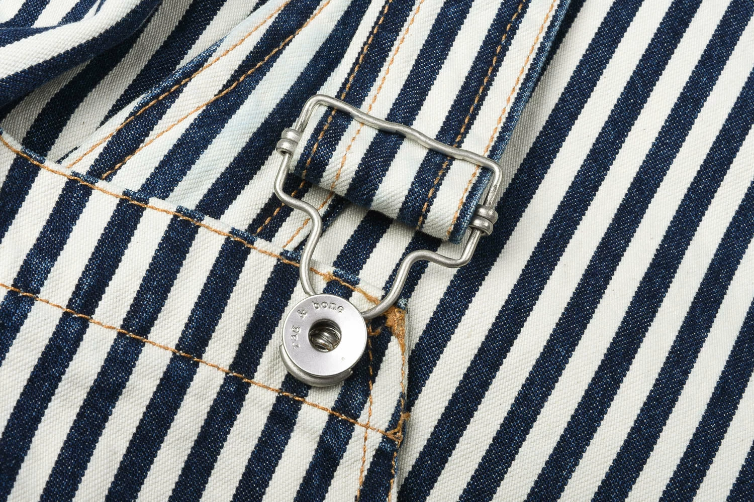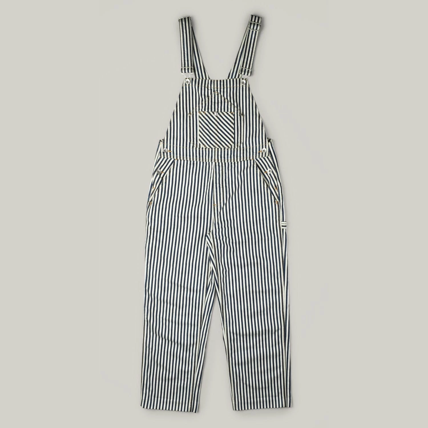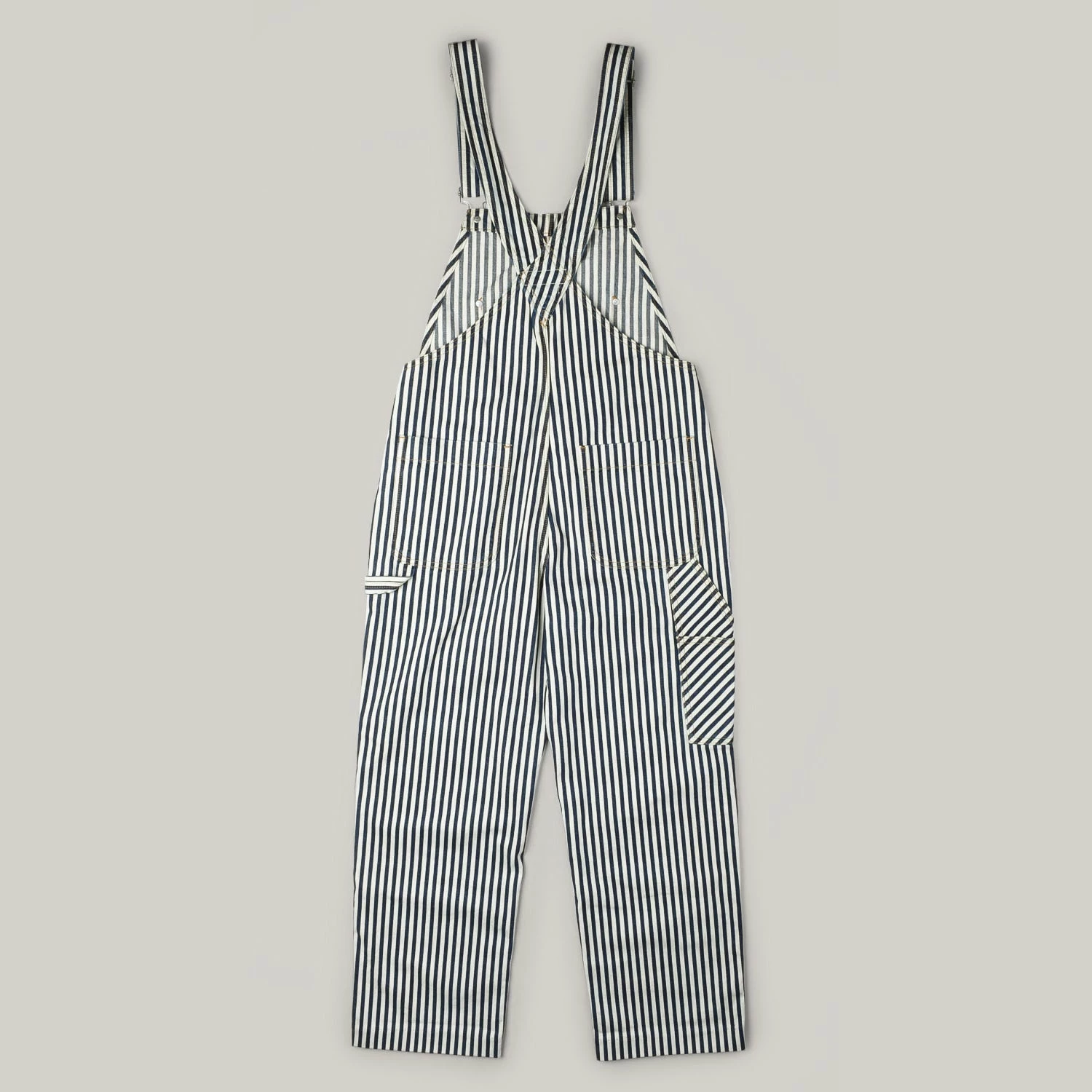 Ladies overalls in a classic workwear hickory stripe. made in 100% cotton, these are designed to be a loose fit at the bust and waist with a wide, slight flared leg. Details include a triangular shaped front pocket with extra twin pocket attached. On the rear are tool loop on left and ruler pocket on right.