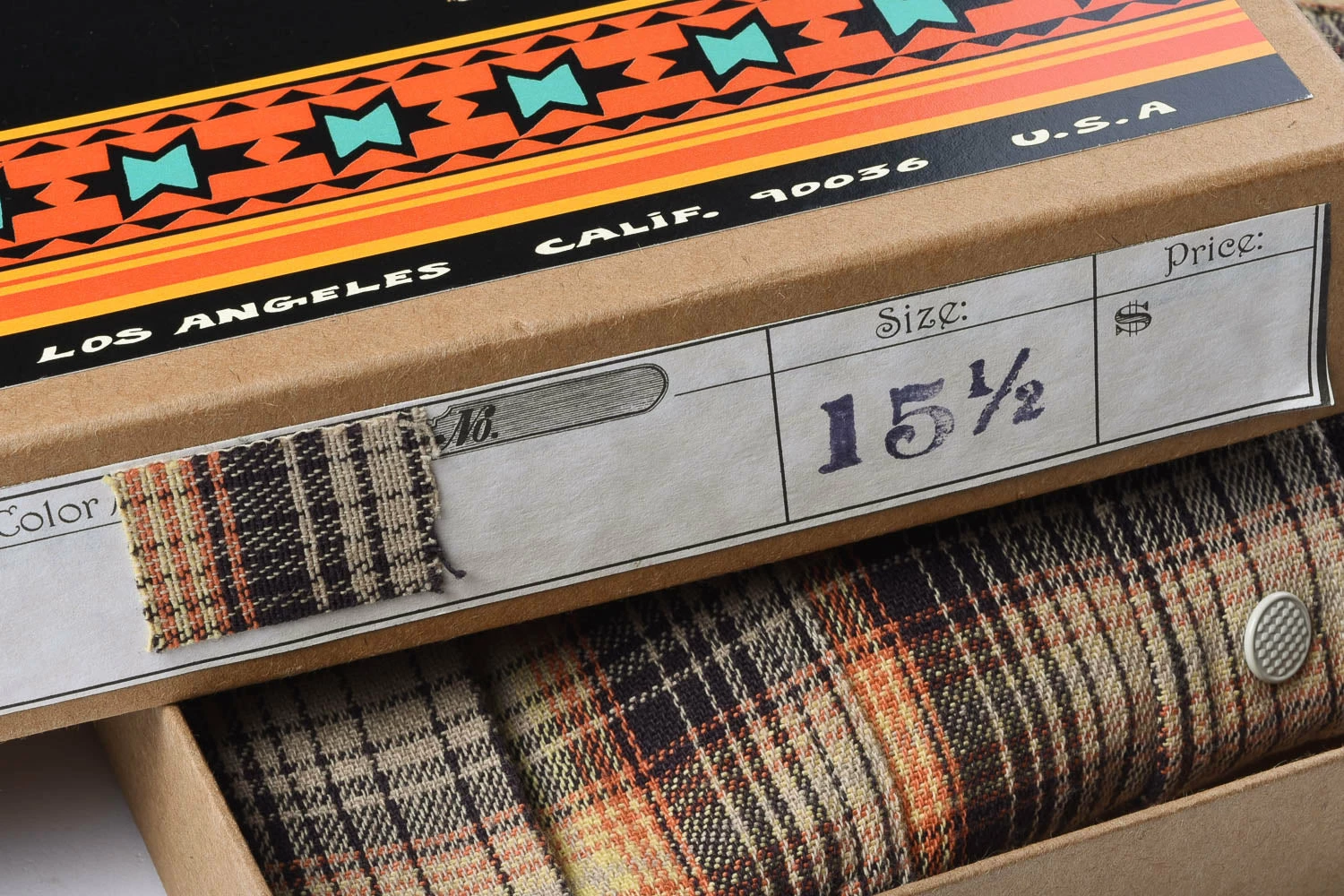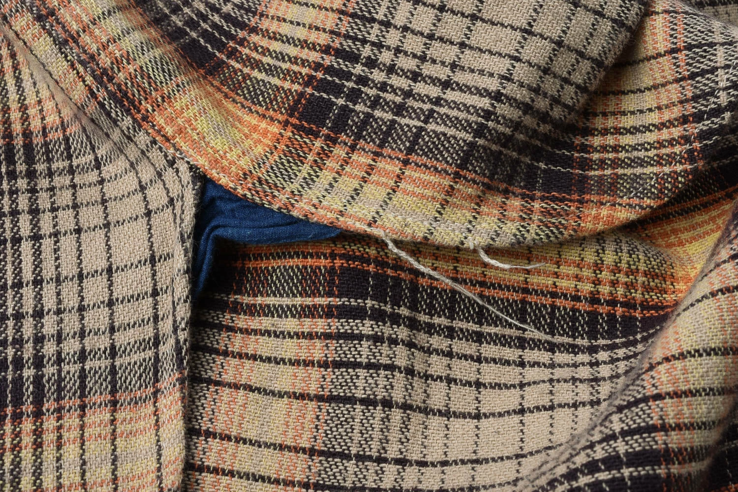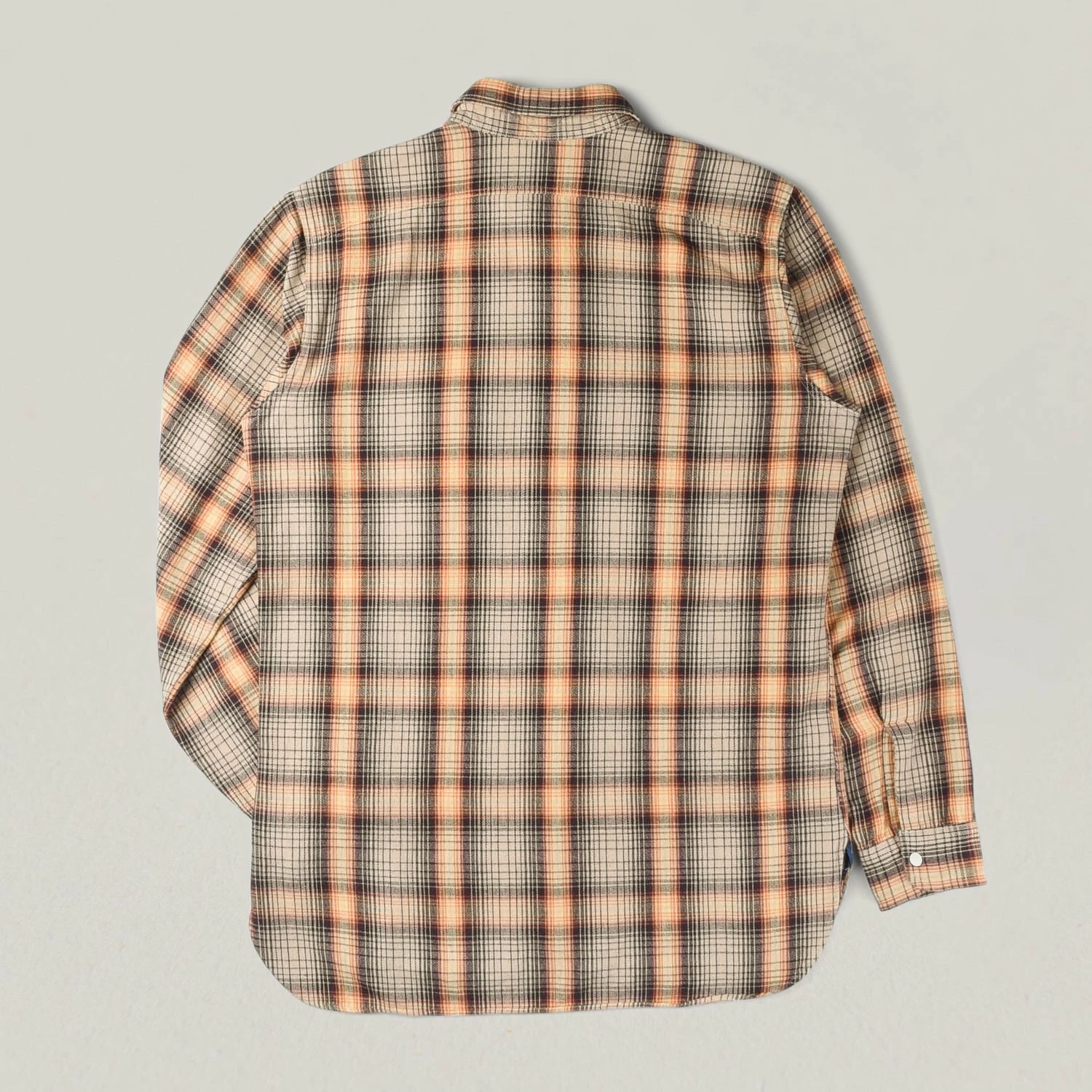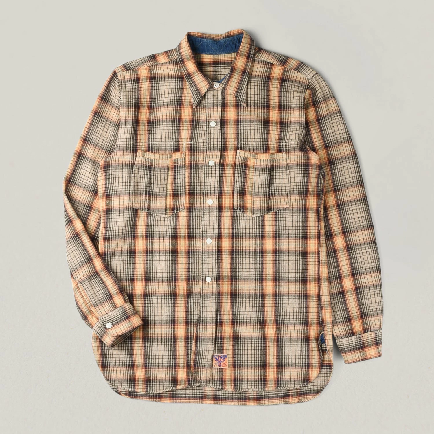 Beautifully aged flannel of beige, yellow, orange and brown have been used for this work shirt. Details include two large bellow chest pockets, indigo fabric used to back the placket and collar plus vintage white dimpled press studs throughout. As always with his garments, the quality is superb.