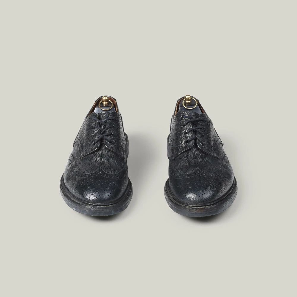 All black solid chunky brogue from English master shoemakers Tricker’s. Constructed in heavy black grain calf leather with a Goodyear welted construction on the bulletproof commando sole. Tough as old…shoes?